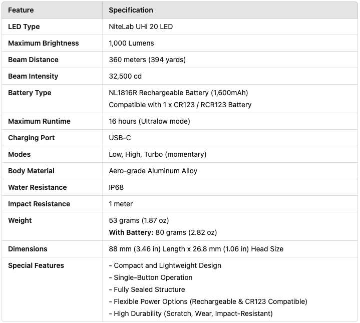 Powered by the advanced NiteLab UHi 20 LED and paired with a SMO reflector, the MT1C Pro produces a crisp, white light ideal for camping, hiking, tactical missions, and emergency scenarios. The flashlight is equipped with a 1600mAh NL1816R rechargeable 18350 battery, providing up to 16 hours of continuous use. The convenient USB-C charging port allows for quick recharging on the go, while compatibility with CR123A, RCR123, and 16340 batteries offers versatile power options.