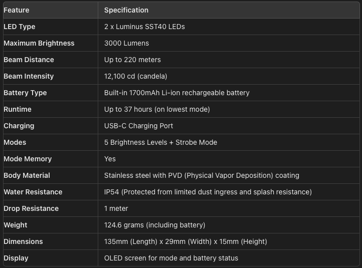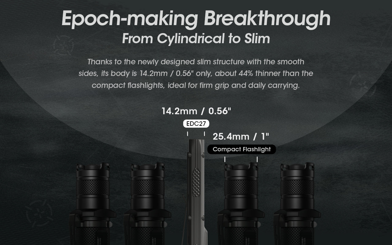 Its 1,700mAh built-in battery is rechargeable via USB-C, providing convenience and a maximum runtime of 55 hours in Ultra Low mode. An integrated OLED display gives real-time information on battery life and mode status, enhancing usability. Built with carbon fiber side grips and a titanium-coated steel frame, this flashlight is both lightweight and durable, rated IP54 for water and dust resistance. Designed for professionals and adventurers alike, the EDC27 delivers exceptional power in a slim, everyday carry design.