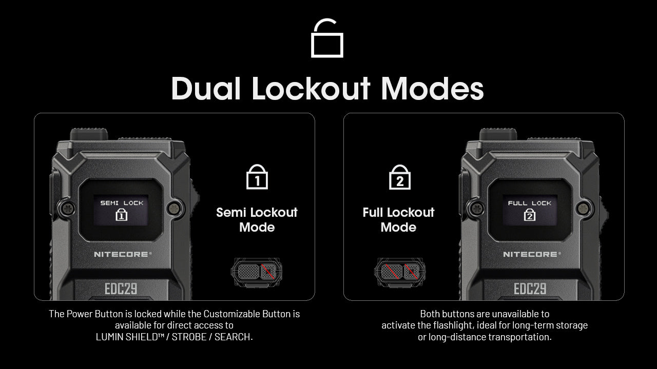 | User Interface | Dual-button (Power + Customizable Button) with Lockout Switch |