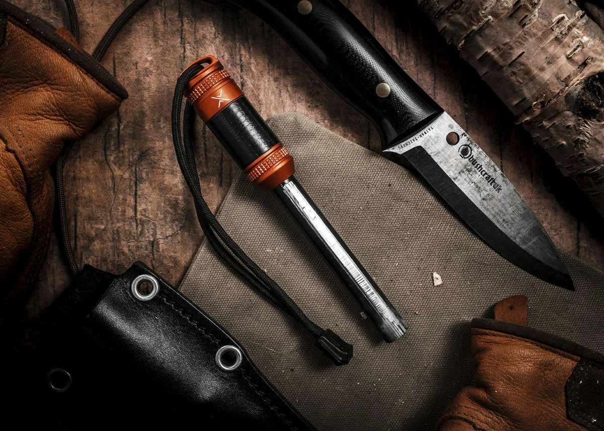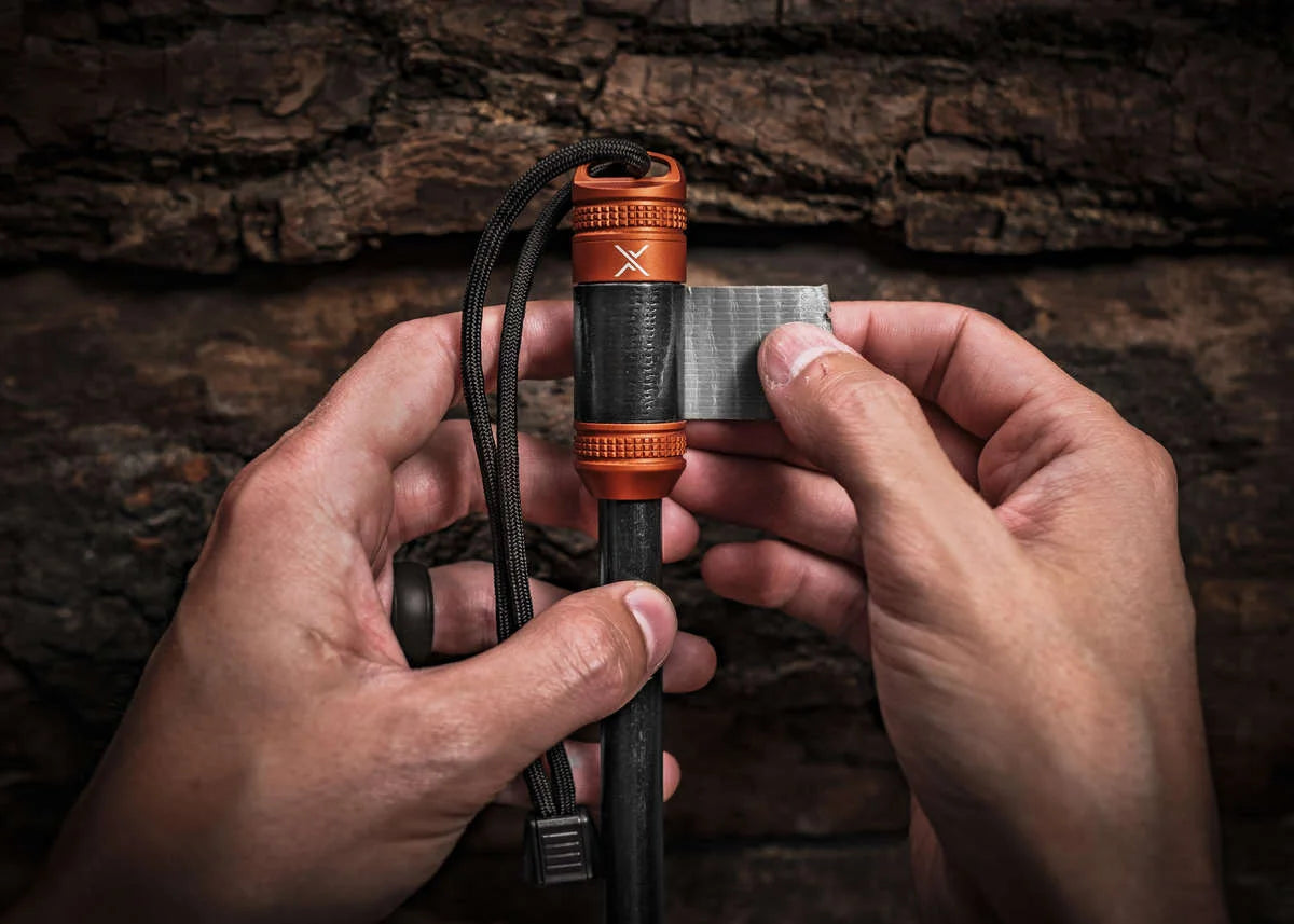 Knife Integration: Utilize your knife's spine as the striking tool for the fireROD XL™, leveraging its sharp edges for efficient fire ignition. Many bushcrafting knives boast unrounded spines, ideal for this purpose.