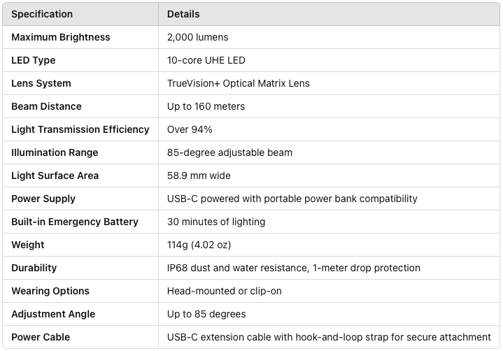 Weighing just 114g, the HU2000 is built for comfort during long-term use, reducing stress on the head and neck. Its IP68 dust and water resistance and 1-meter drop protection make it rugged enough for harsh environments, while its clip-on and head-mounted options offer adaptability. With an additional 30 minutes of emergency lighting when the power runs low, the HU2000 ensures you’re never left in the dark.