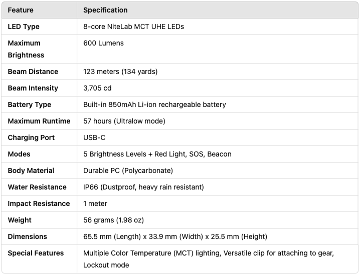 The Nitecore NU27 is an exceptional lighting tool, designed for outdoor enthusiasts and professionals alike. Offering a powerful 600 lumens in a lightweight, compact frame, it’s perfect for a wide range of activities, from camping and hiking to night running. The headlamp’s Multiple Color Temperatures (MCT) LEDs allow for versatile lighting, with three settings: Warm White (3000K) for improved visibility in fog or rain, Neutral White (4500K) for natural, balanced lighting during day-to-day activities, and Cool White (6500K) for bright, crisp light, ideal for night running or high-focus tasks. Despite its impressive capabilities, the NU27 weighs just 56g (1.98 oz), making it comfortable for long-term use without causing discomfort.