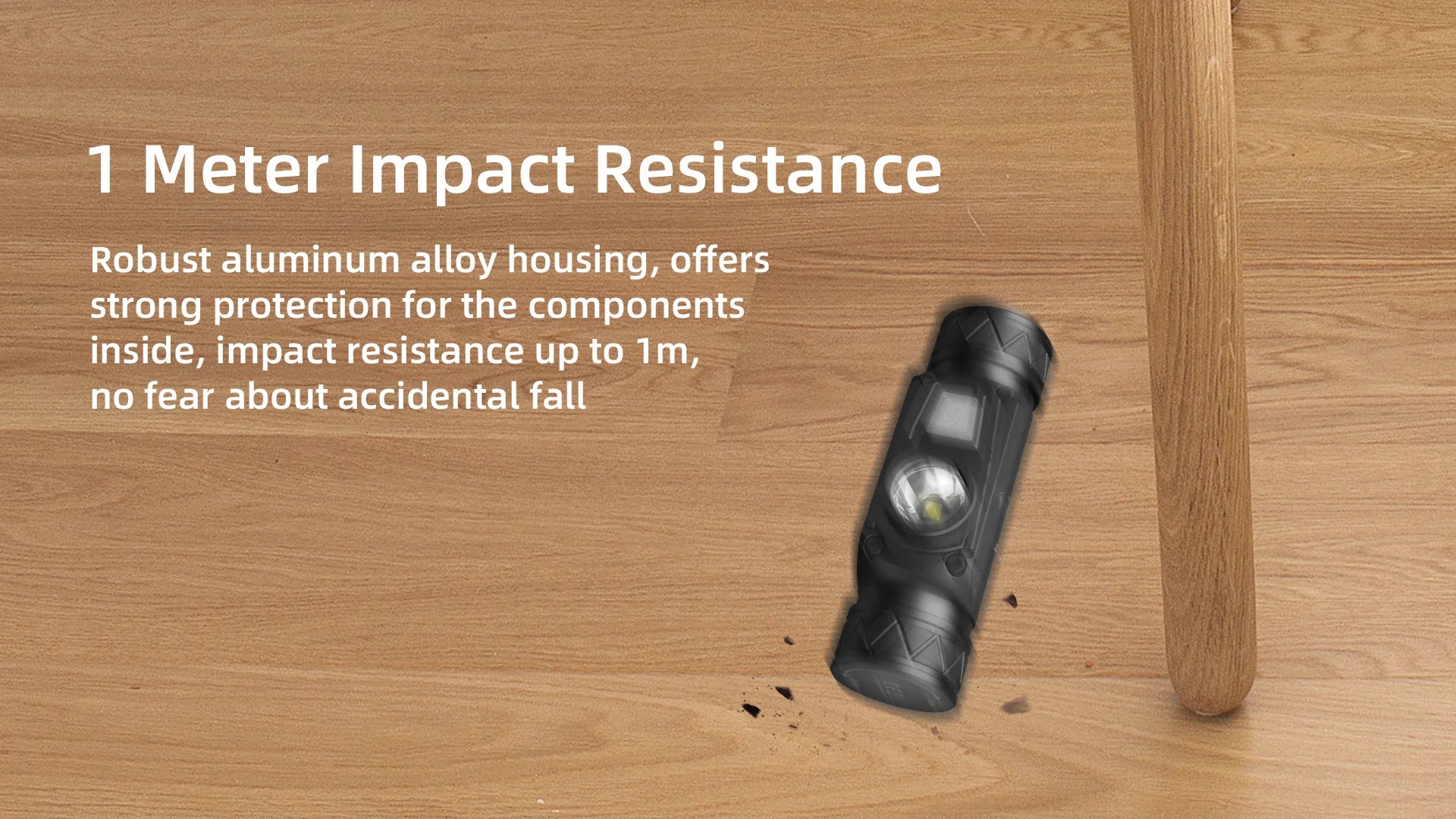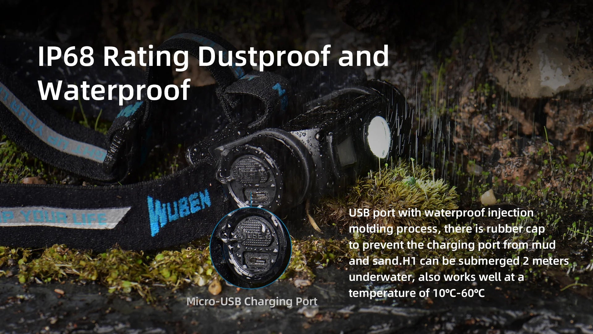 Rated IP68 for submersible waterproofing and tested to survive one-meter drops, the Wuben H1 is built to withstand rain, mud, and accidental impacts. Onboard micro-USB charging with built-in overheat protection replenishes the battery in under two hours, and a lock-out function prevents accidental activation in transit.