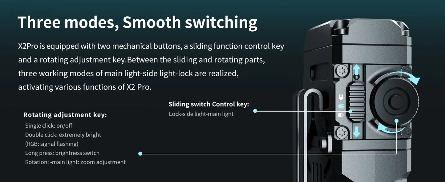 It runs on two replaceable 14500 rechargeable batteries and is also compatible with standard AA cells—ensuring flexibility in power supply. The flashlight includes a rotary mode selector and sliding switch for fast, intuitive control. Its RGB or UV side light adds functionality for signaling, inspections, or tactical tasks. With IP68 waterproofing and a durable aluminum alloy body, the X2 Pro is built to endure rough handling while maintaining high output and runtime performance.